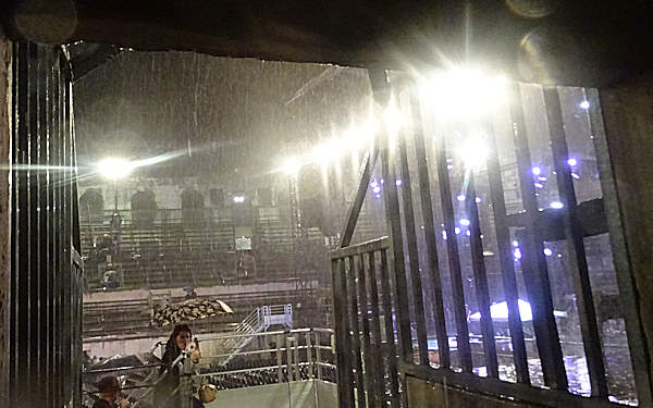 Les 10 000 spectateurs se sont retrouvés à l’abri dans les couloirs de l’arène. Le faible espoir que la pluie cesse et que le concert se poursuive n’a pas résisté longtemps. Les trombes d’eau ne faisaient que redoubler. L’ambiance était cependant bon enfant.