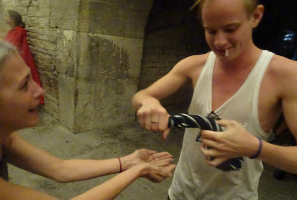 En nous déplaçant dans les coursives, nous avons croisé Chiara, la chérie d’Anli. Jusque-là, une coïncidence sympa mais rien de très renversant. On a échangé quelques mots et on s’est séparés. Un peu plus loin, une jeune fille trempée (comme nous) et transie de froid (comme nous) s’est approchée timidement de Stéphanie et lui a demandé une cigarette. Stéphanie lui en a offert une et elles ont commencé à bavarder.