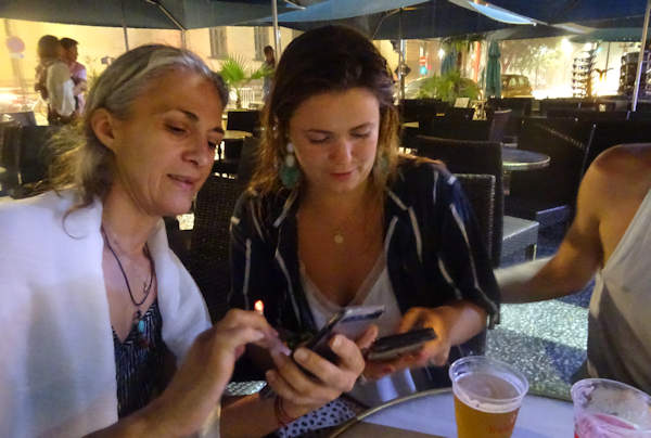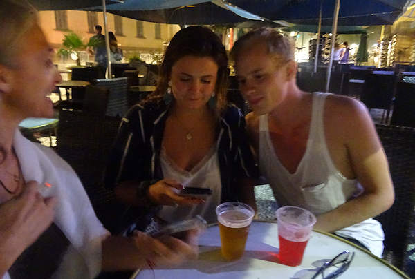 On est parti boire un verre dans une brasserie. On n’arrêtait pas de rire de cette rencontre incroyable. J’ai montré à Gabriela certaines des photos que j’avais prises d’Anli sur scène. Elle a photographié l’écran de mon appareil pour envoyer l’une d’entre elles à Anli. Il a aussitôt répondu : « Comment tu as eu cette photo ? » (puisque la veille, rappelons-le, elle était à Barcelone). En guise de réponse, Gabriela nous a pris en photo, Stéphanie et moi, et l’a envoyée à Anli. Réponse d’Anli : « Mais comment tu peux les connaître !!! C’est ma deuxième famille ! » Gabriela, hilare, lui répond : « Je ne les connais pas ».
