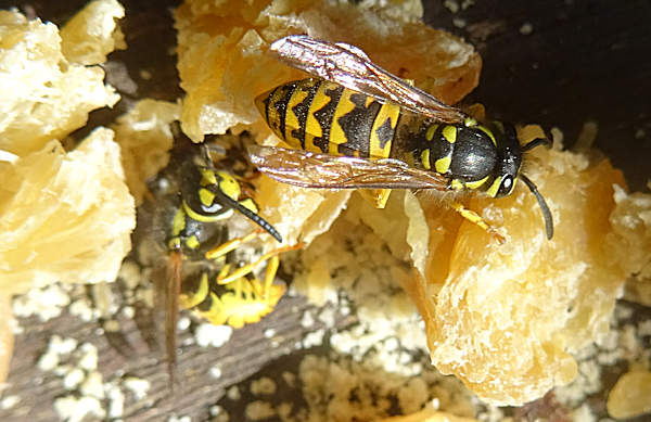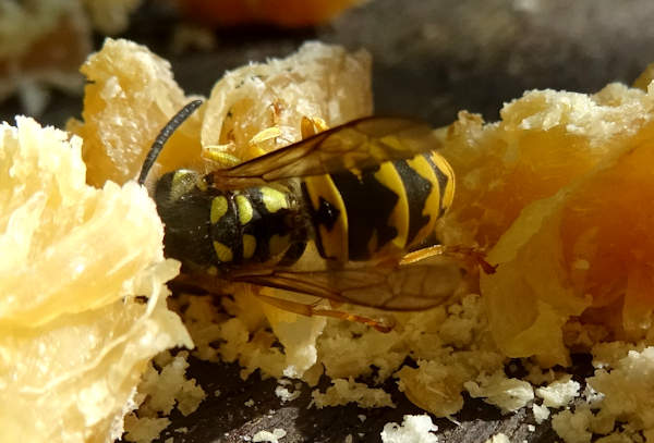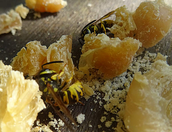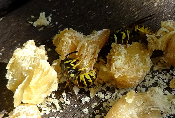 C’était il y a quelques jours, sur la table qui se trouve dehors, sur la terrasse. Quelques morceaux de poulet destinés à Merva traînaient là. Deux guêpes les ont vite repérés et en ont fait leur festin, découpant avec gourmandise et efficacité les bouts de poulet en minuscules fragments adaptés à leur anatomie. Chez nous, rien ne se perd. Tout notre petit écosystème profite de la nourriture proposée.