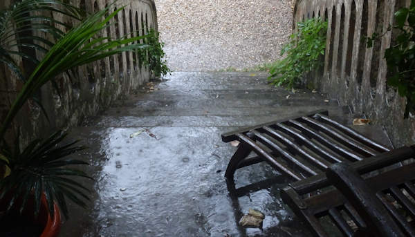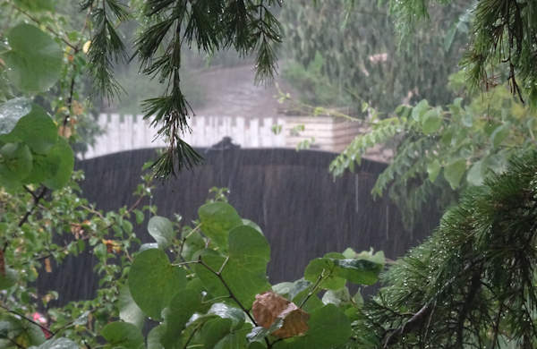 Vers 3 h 30 du matin, il y avait eu quelques rares petites gouttes. Puis à 4 h 40, très fugitivement aussi. Et encore un peu à l’aube. Puis, le tonnerre a retenti en approchant de midi, suivi d’une belle averse. On s’est dit : « Espérons que ce n’est pas fini ». Ca ne l’était pas. Plusieurs vrais orages avec des trombes d’eau se sont enchaînés dans l’après-midi (dont un pendant que je faisais des courses mais j’étais super heureux de me prendre la saucée).