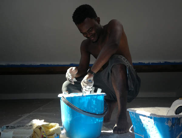 Nous avons eu en cours de chantier l’aide amicale et très appréciée d’Anli et de Mouayadi. Un très grand merci à eux. Cela nous a valu de nombreux fous-rires pendant les séances de peinture, ce qui a rendu les courbatures plus supportables. Ce soir, on fête la fin des travaux avec du champagne, ils seront bien sûr des nôtres.