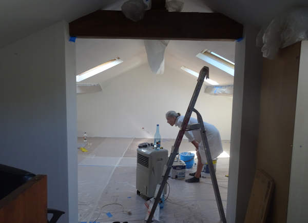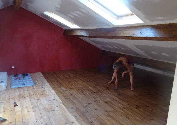 La dernière tranche avant ré-emménagement de tout le mobilier a été le traitement du parquet et la peinture des murs et des pentes de toit. Je ne sais plus depuis combien de semaines on y travaille (surtout Anti pour le ponçage du placo et le parquet), dont une bonne partie en pleine canicule. Un seul objectif, fixé dès le début par Anti : la perfection. Pour la peinture, du blanc immaculé, sans une trace.