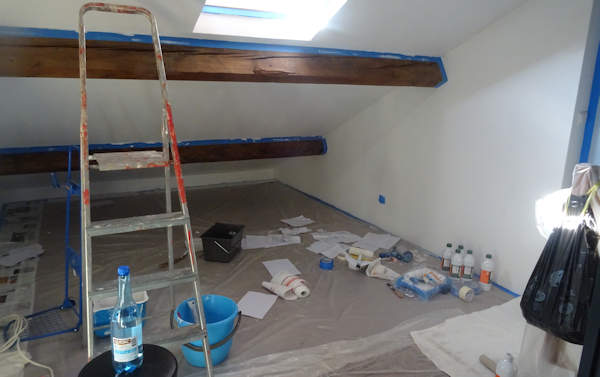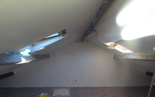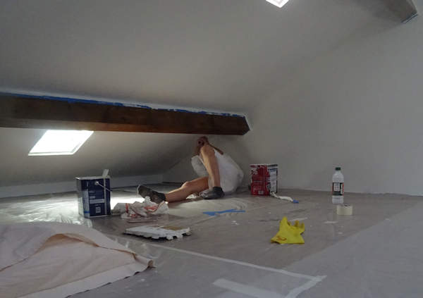 Ca y est, on y est arrivés ! A quoi ? A terminer les travaux des combles, commencés en 2011 et menés tranche par tranche, étape par étape, depuis un grenier quasi inaccessible jusqu’à deux grandes pièces lumineuses. Elles vont servir en partie de bureau pour Anti, en partie de salle de répétition pour les batteries, en partie de chambre d’appoint, en partie de nouveau domaine pour les chats (ils y venaient depuis qu’il y a un escalier), et tout cela c’était déjà plus ou moins le cas depuis que le plancher et les vélux sont posés, mais là, ça va être infiniment mieux.