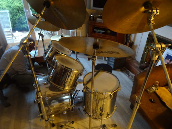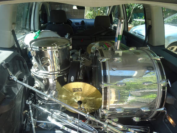 Du coup, je l’ai chargée dans le Touran jeudi soir à Nîmes, et déchargée à Guidel hier soir à mon arrivée. Bon, j’ai oublié le pied de caisse claire, Anti va l’apporter quand elle viendra. Mais quand même, avouez que ça a de la gueule. En tout cas, moi je trouve.