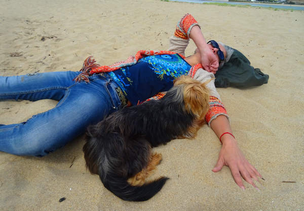 En fait, il y avait trois chats, dont un qui ne s’est jamais montré. Ah, et il y a aussi un toutou hyper sympa, Jazzy. Lui aussi est breton, comme cela se détecte en observant comment il s’allonge sur le sable à côté d’une Bretonne pur beurre. Voyez plutôt :