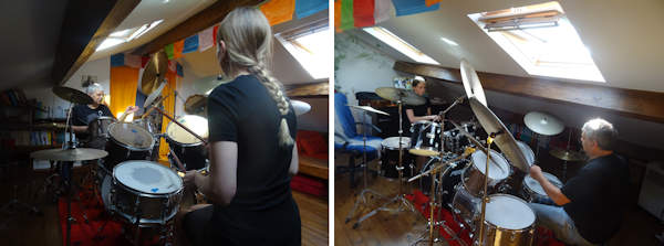 C’était très réjouissant à voir. J’ai donné à Ilona quelques indications sur des variations possibles, elle était vraiment enchantée et Anti au moins autant. A la demande de cette dernière, je lui ai aussi fait écouter un nouveau morceau sur lequel je travaille et ensuite, Anti a proposé qu’on monte d’un étage pour une petite démonstration de batterie. Puis on a joué quelques motifs à deux batteries et finalement, Ilona a pris place derrière la seconde batterie.