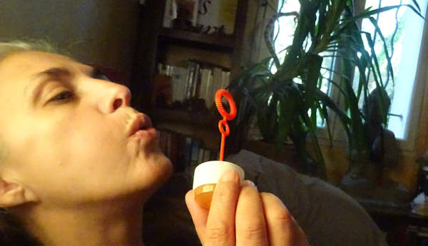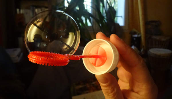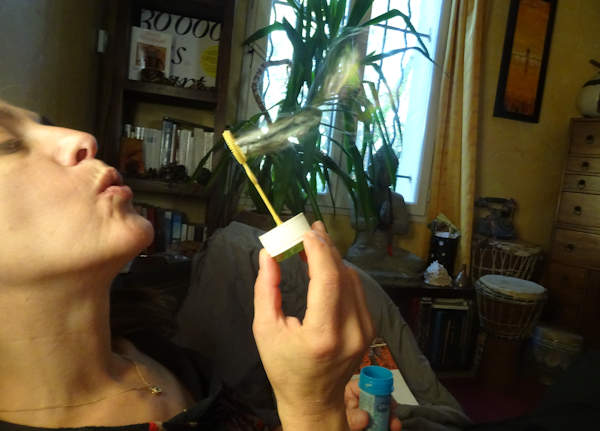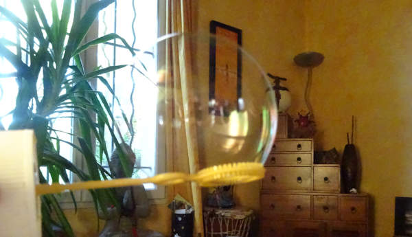 J’ai des joies simples 🙂 J’ai toujours aimé les bulles de savon. C’est beau, c’est léger, gracieux, fragile, parfumé, pétillant ! Quand les enfants étaient plus petits, lors des anniversaires notamment, je remplissais une bassine d’eau savonneuse et nous faisions des nuées de bulles tous ensemble. Honnêtement, je m’éclatais autant qu’eux !