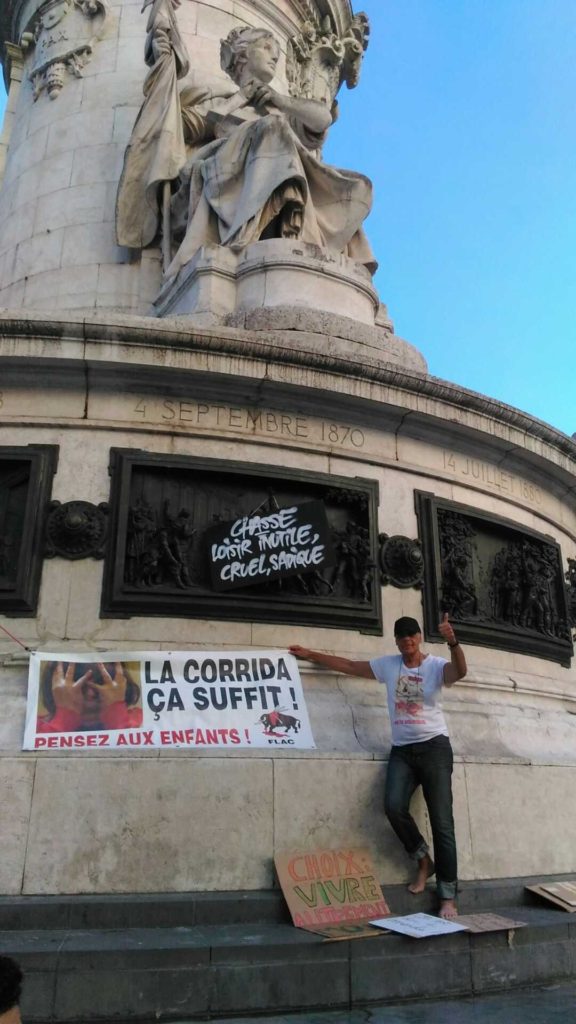 Hier avait lieu à Paris une grande manifestation unitaire contre la chasse. Notre association No Corrida y était représentée par la fédération dont nous faisons partie (et dont je suis le secrétaire fédéral), la FLAC (Fédération des luttes pour l’abolition des corridas). Thierry Hély, son président, a pris plaisir à déployer une banderole devant la statue mythique de la République.