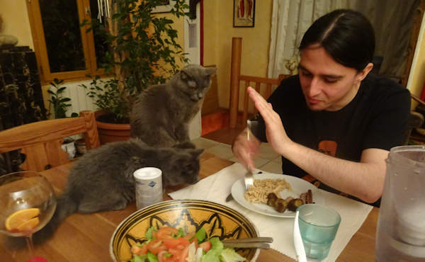 Nous, on ne présente quasiment pas d’intérêt à leurs yeux depuis des années qu’on est devenus végé, quoique, on a eu de temps en temps des surprises : Maoré qui adore le chou cru, plusieurs qui ne dédaignent pas les olives (dénoyautées) ou les cacahuètes et, récemment, Tsewa qui se régale d’haricots verts cuits.