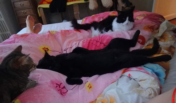 Photo prise par Anti, dont on voit les pieds en haut à gauche, ce qui prouve que, elle aussi, elle sait dormir sur le dos 🙂