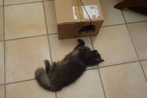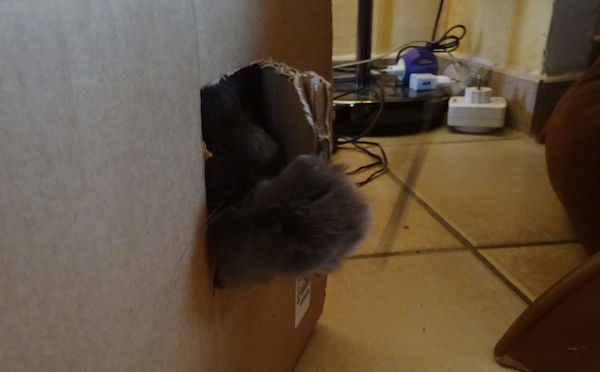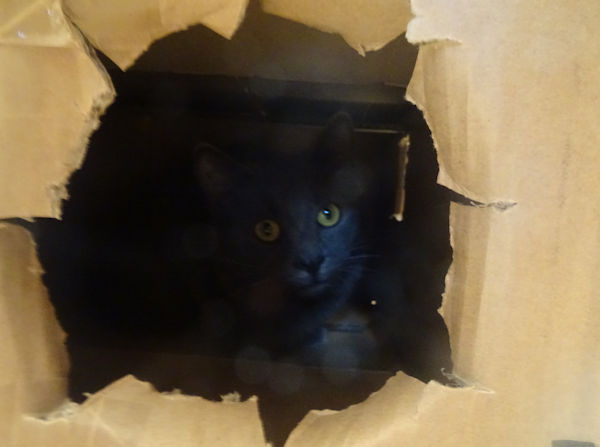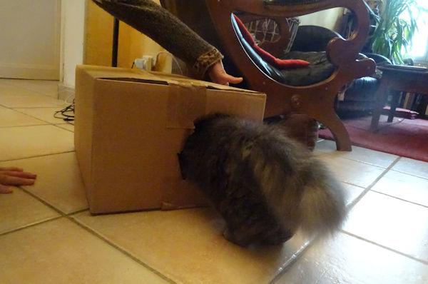 Tous les petits enfants et tous les chats vous le diront : le plus beau cadeau, c’est l’emballage. Surtout si c’est une boîte en carton. Aucun chat n’y résiste. Soit il s’installe dedans, quelle que soit sa taille (celle du chat) par rapport à celle de la boîte, soit elle est transformée avec quelques coups de ciseaux en maison irrésistible. C’est ce qu’a fait Anti hier lorsqu’on a reçu une livraison de nourriture pour nos minous. Tsewa passait par là…