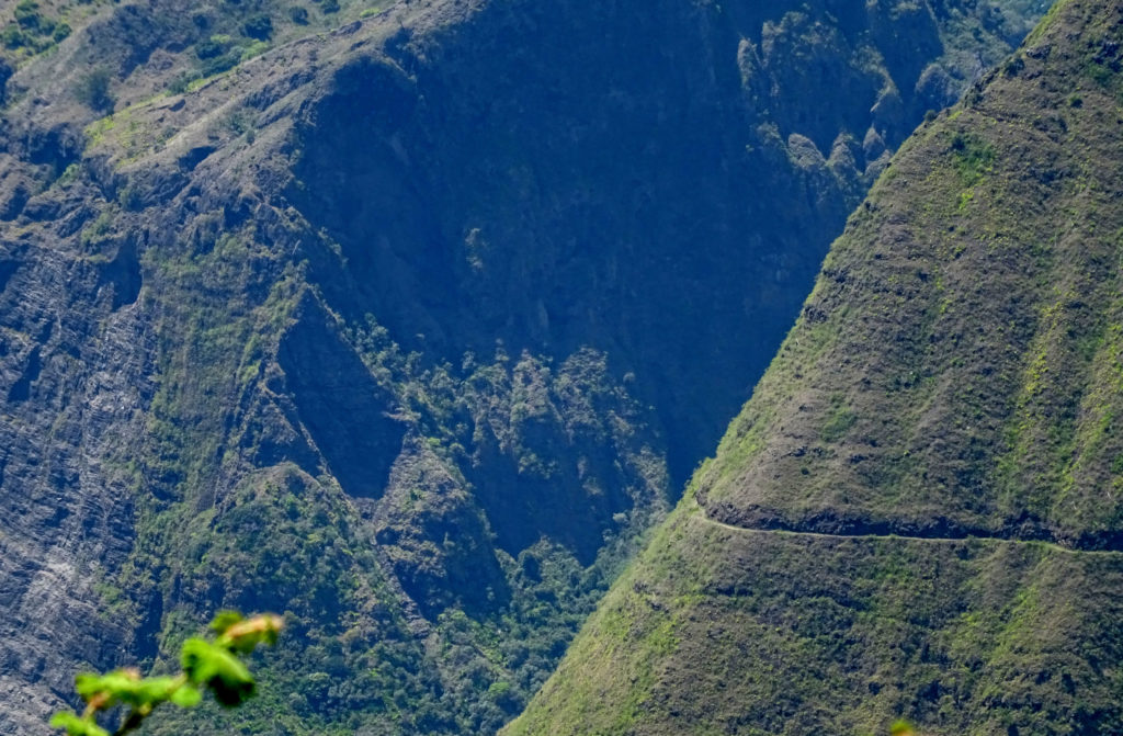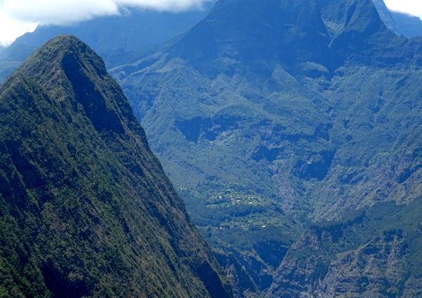 Quelques dizaines de personnes vivent au coeur du cirque de Mafate, dans des maisons rassemblées en minuscules hameaux, nommés des îlets. On en distingue quelques-uns sur cette photo prise au zoom (les petits points blancs vers le centre de l’image):