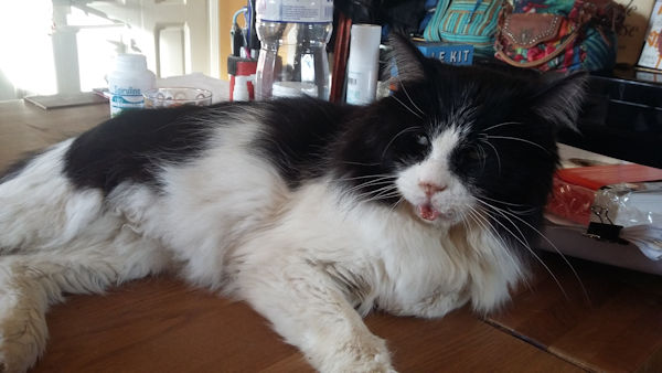 Depuis son arrivée chez nous il y a à peine plus d’un an et il y a encore quelques semaines, Mimi avait très mal à la langue en raison d’ulcères causés par une saloperie de virus. Et comme il est FIV+, impossible de le traiter sur la durée avec des corticoïdes puisqu’ils affaiblissent encore plus le système immunitaire. Du coup, en plus d’avoir du mal à manger, il bavait énormément, ne pouvait faire sa toilette et avait donc en permanence un aspect sale sur le devant de son cou sans cesse maculé de traînées noirâtres. Mais ça, c’était avant. Désormais, il est beau de partout.