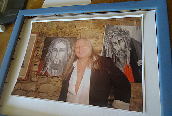 Avec le temps magnifique qu’il faisait hier, nous avons eu envie de rouler vers la mer. Anti a alors eu l’idée d’aller aux Saintes-Maries et de déposer dans la crypte de l’église, au pied de Sara la Noire, des photos de Jean-Gilles en sa mémoire. Il s’était marié dans cette même église en juin 2017. Avant de partir, Anti a préparé deux photos dans des cadres : l’une récente de Jean-Gilles devant ses magnifiques visages de Christ (il nous en a offert deux il y a quelques années) et l’autre plus ancienne, de dos, en train de dessiner lors de l’une de ses expos aux Saintes pendant le pèlerinage, la première fois où nous l’avons rencontré.