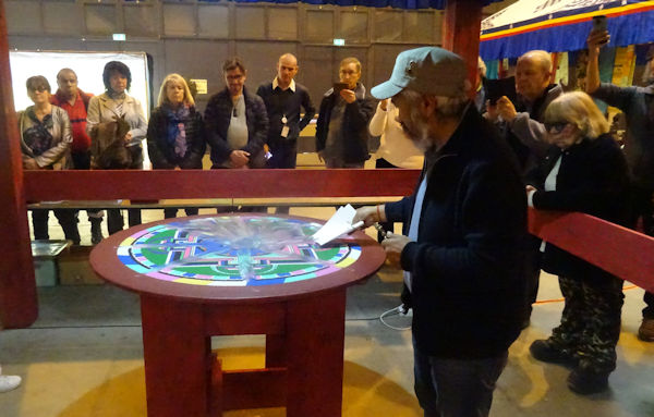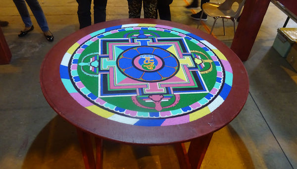 Parmi les stands, un petit mandala avait été réalisé par Dorjee Sangpo, un artiste tibétain qui vit à Paris depuis pas mal d’années. Initialement, des moines résidant en Inde auraient dû s’en charger, mais leur visa a été refusé par le gouvernement indien. Nous avons pu assister à la dissolution de ce mandala et repartir avec deux pochettes de sable.