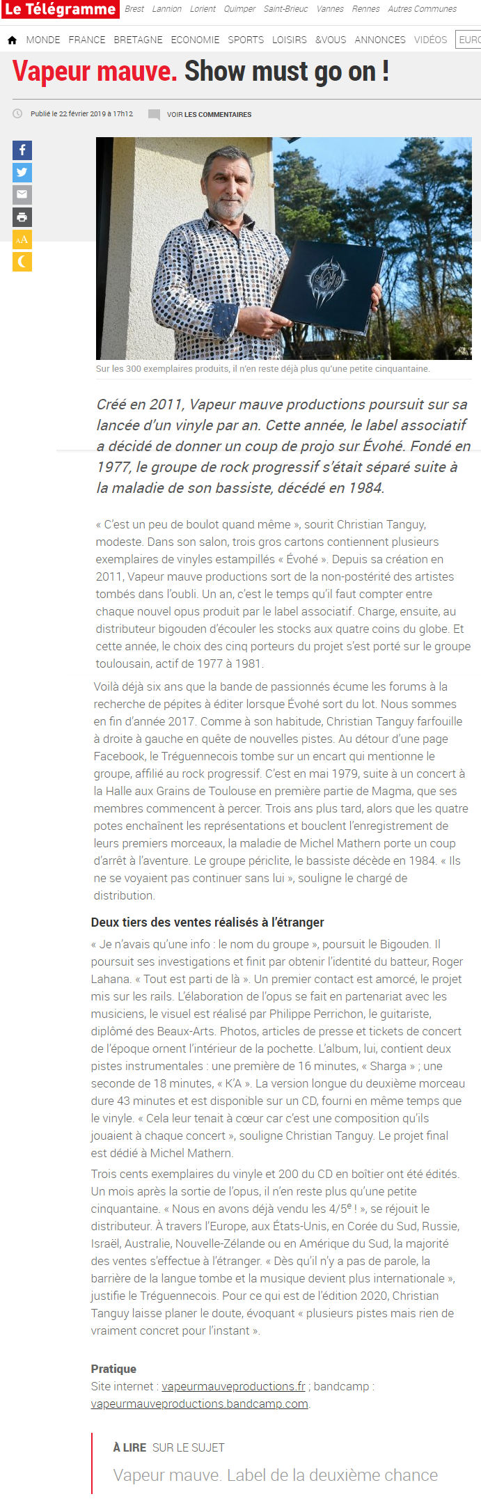 Alors là, c’est la consécration : la sortie de l’album d’Evohé nous a valu un bel article dans le Télégramme de Brest. Et ce n’est pas rien, le Télégramme de Brest, comme pourront vous le dire les vrais fans de rock punk français, plus particulièrement des Wampas (voir à la fin de cette note).