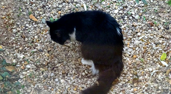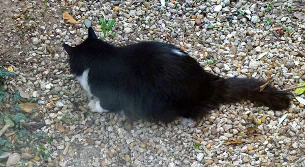 A son arrivée, il a voulu se poser un peu dans SON jardin. Il s’est installé juste devant l’une de nos fenêtres, a poussé un peu le gravier pour que ce soit plus confortable et s’est allongé là, à regarder les feuilles pousser, avant de reprendre ses allées et venues dans la maison.