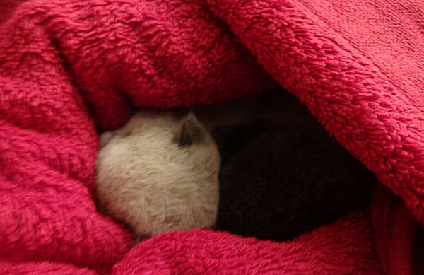 Anti lui a dit d’apporter aussitôt les bébés. Ils semblent avoir deux semaines environ. Anti a commencé à préparer un biberon de lait maternisé pour chats. Mais à peine rentrée chez elle, Sarah a rappelé pour dire que la maman était repassée. Du coup, Anti est partie là-bas avec un piège, après avoir installé au fond les deux bébés soigneusement emmitouflés dans une serviette pour servir d’appât irrésistible.