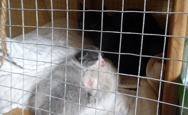 Quelques minutes plus tard, elle était de retour, avec la maman et ses bébés. La petite famille vient de passer sa première nuit dans la grande cage située dans notre chambre. Il va falloir les garder enfermés pendant quelques temps avant de pouvoir les laisser circuler dans la maison. D’une part, il ne faudrait pas que la maman s’enfuit et d’autre part, nos propres chats doivent s’habituer à leur présence. Anti va graduellement gérer ça.