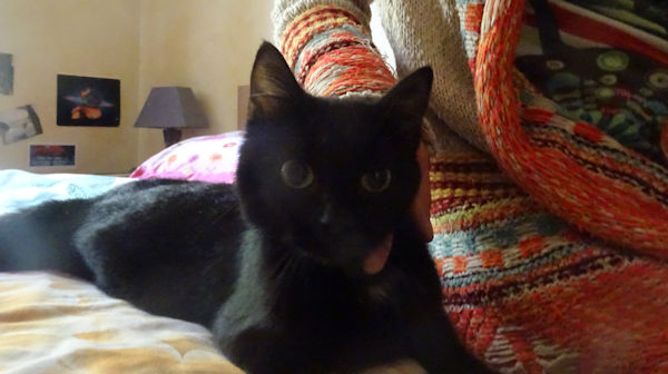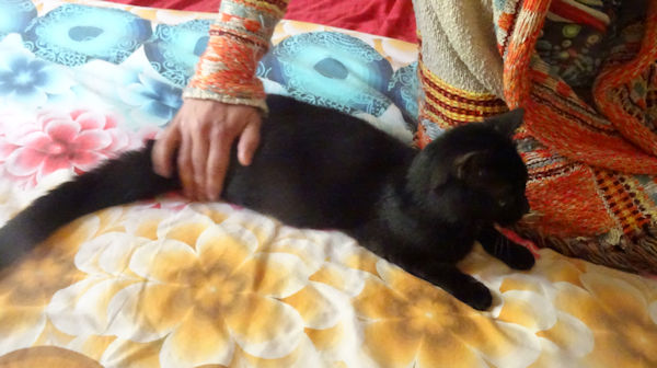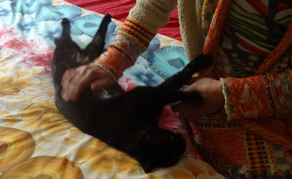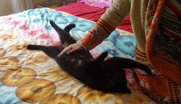 La petite maman chatte qui est actuellement locataire chez nous se sent vraiment très détendue. Mieux, elle adore les câlins, comme si elle habitait là depuis toujours, sans aucune appréhension. Voyez plutôt :