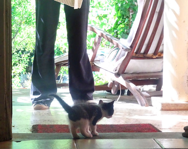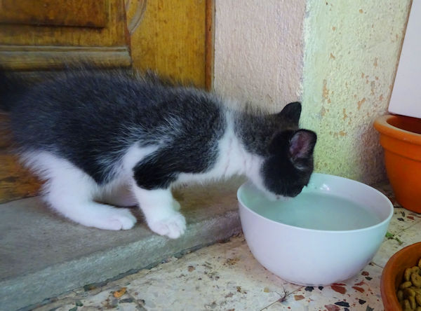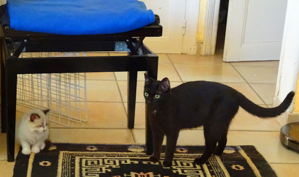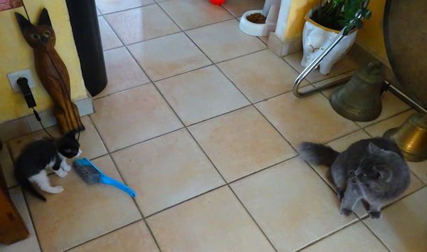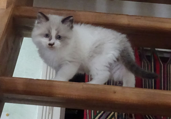 Les chatons se sont mis sérieusement à explorer la maison depuis qu’on les laisse circuler librement, la maman étant moins stressée par les autres chats, qui ne montrent aucun signe d’agressivité à l’encontre des petits. Et puis ils sont désormais tout à fait capables de monter et descendre le grand escalier qui mène aux combles, là où ils habitent en ce moment.