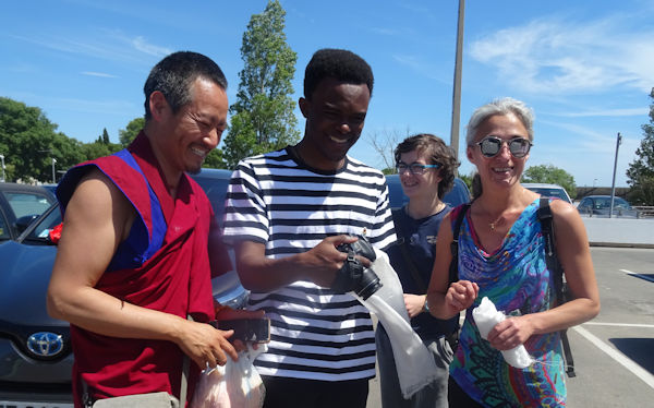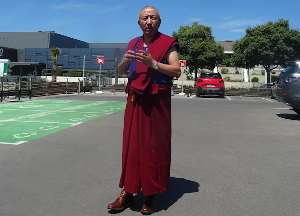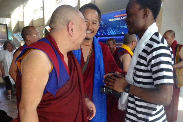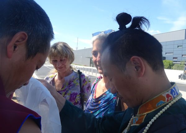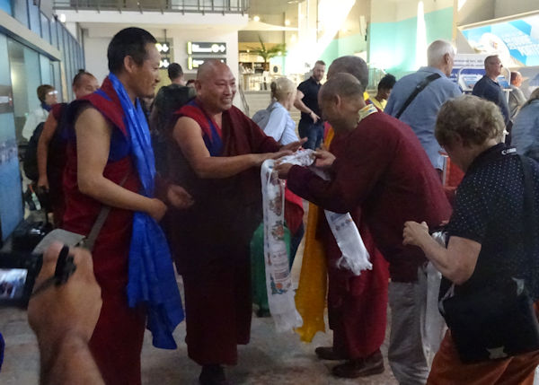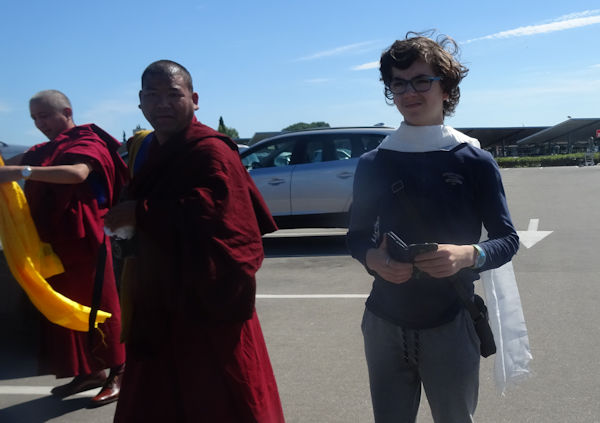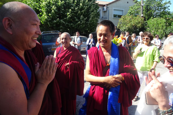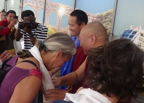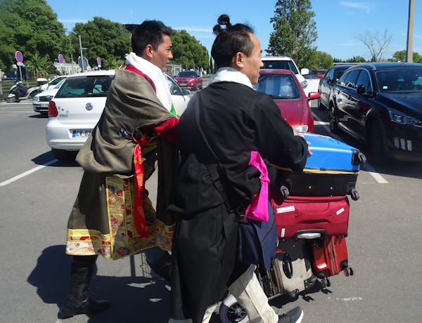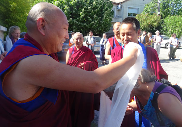 Hier, Sa Sainteté le 34e Menri Trizin (abbé de Menri) est arrivé à l’aéroport de Montpellier accompagné de plusieurs autres guéshés du même monastère, pour quelques jours d’enseignements, ainsi qu’un spectacle de danse traditionnelle et un de chants sacrés. Les retrouvailles avec Lama Samten étaient à la fois solennelles et chaleureuses, l’amitié profonde qui les lie se superposant à la déférence qui est désormais due à celui qui représente pour la lignée Bön l’équivalent du Dalaï Lama pour la lignée gelugpa ou du Karmapa pour la lignée kagyupa.