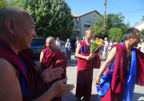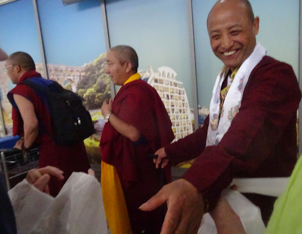 Hier, Sa Sainteté le 34e Menri Trizin (abbé de Menri) est arrivé à l’aéroport de Montpellier accompagné de plusieurs autres guéshés du même monastère, pour quelques jours d’enseignements, ainsi qu’un spectacle de danse traditionnelle et un de chants sacrés. Les retrouvailles avec Lama Samten étaient à la fois solennelles et chaleureuses, l’amitié profonde qui les lie se superposant à la déférence qui est désormais due à celui qui représente pour la lignée Bön l’équivalent du Dalaï Lama pour la lignée gelugpa ou du Karmapa pour la lignée kagyupa.