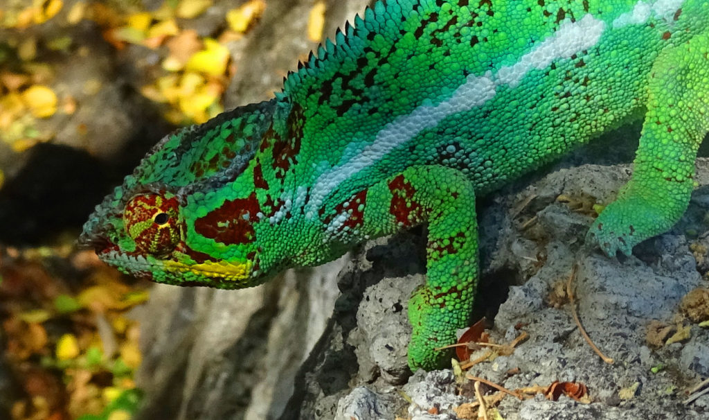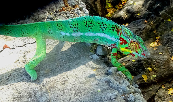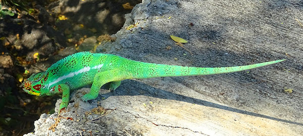 L’un des deux animaux qui symbolisent La Réunion est l’endormi, l’autre étant un bel oiseau blanc nommé le paille-en-queue. L’endormi, de son vrai nom le caméléon panthère, est un saurien originaire de Madagascar, d’une trentaine de centimètres de long, haut sur pattes, aux couleurs chatoyantes, qui a la particularité de se déplacer très lentement et de se figer immobile pendant de longs moments un peu n’importe où. Ce qui peut être très dangereux pour lui lorsqu’il choisit de le faire au milieu d’une route.