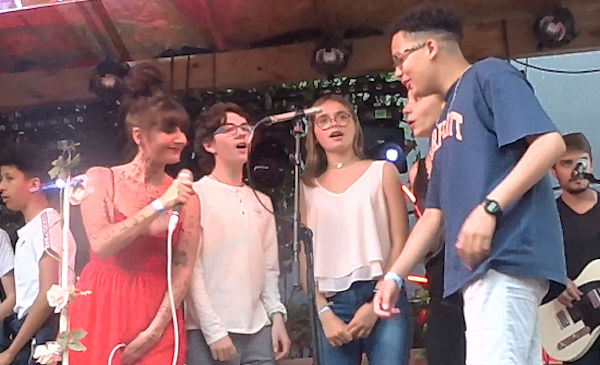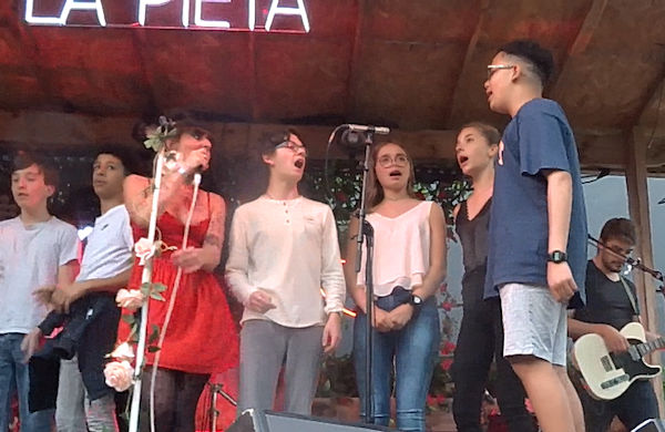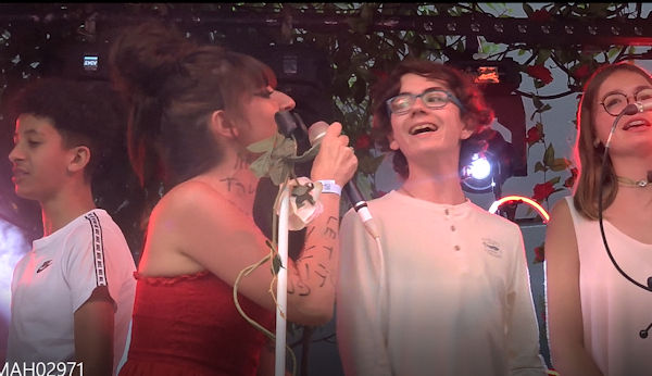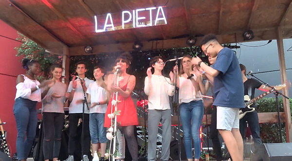 La Pieta est le nom de scène d’une artiste très originale, qui fourmille d’idées musicales et visuelles. Ces derniers mois, elle a ainsi proposé à une vingtaine d’élèves du collège Jean Rostand de Nîmes (dont Enzo) de créer ensemble un morceau original : paroles, musique, répétitions, tournage d’un clip dans le collège et, il y a deux jours, représentation en public avec neuf des collégiens, aux abords de Montpellier. La chanson s’appelle « Imbécile heureux ».