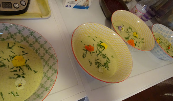 Bon, je vais juste vous montrer un aperçu de ce que Le Chef nous a cuisiné pour ce premier soir. Au menu, une soupe froide à l’oseille avec des petits morceaux de ciboulette et des fleurs (des pensées, délicieuses).
