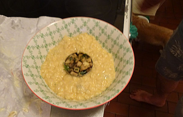 Puis le célèbre risotto que notre Chef chéri maîtrise à merveille, à base de riz carnaroli, de champignons, de vin blanc, de gorgonzola et de quelques autres ingrédients que je n’ai pas eu le temps de noter.