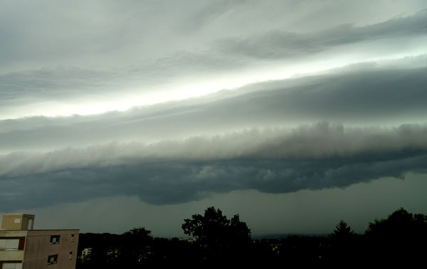 Alors que la journée avait commencé par un magnifique ciel bleu, le temps a changé en quelques dizaines de minutes au-dessus du Jura et la dépression en question s’est décalée vers nous. Le ciel a viré à l’apocalypse, formant un gigantesque enroulement de nuages, alors que la foudre tombait à l’horizon à de multiples reprises. C’était magnifique.