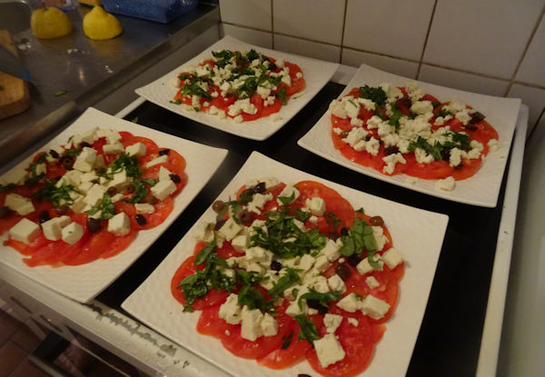 Pour suivre, il nous a préparé une variante de la toujours appréciée tomates-mozza, sauf que, Le Chef étant qui il est, il n’allait pas utiliser une banale mozzarella, même haut de gamme. Il nous a fait découvrir un délicieux fromage suisse, le sérac. Sa caractéristique est qu’il est tiré du lait de vaches nourries entièrement dans les alpages et uniquement lorsque les fleurs parsèment les herbages. Il n’est donc produit que pendant l’été. Avec ça, de généreuses tomates découpées en tranches, des feuilles de basilic frais, un filet d’huile d’olive extra vierge, quelques olives, un peu de sel et miam, à table ! A tomber !