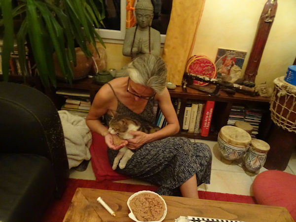 En rentrant, gag, on ne l’a pas trouvé tout de suite. Mais il était là, bien sûr. Anti a pu lui donner son traitement quotidien. Et du rab de la super pâtée hyper riche qui permet de lui apporter toute la nourriture nécessaire en un minimum de volume, parce que même manger est compliqué pour lui en ce moment (il n’aima pas pencher sa tête vers le bas, cela doit lui faire mal, du coup Anti le nourrit en mettant la pâtée dans sa main, c’est très efficace).