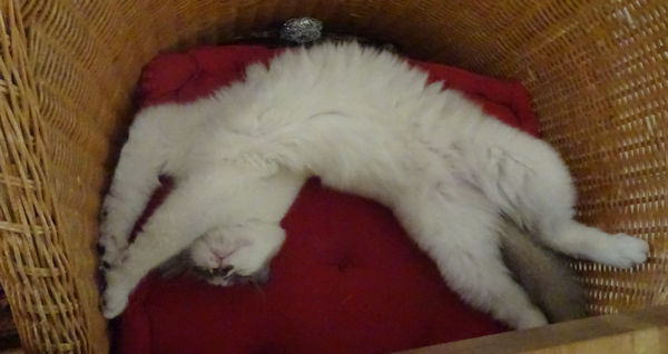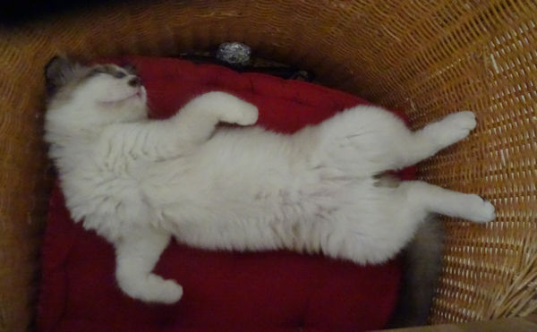 Bianco continue à nous faire fondre avec les poses qu’il prend pour dormir. Très souvent sur le dos, tout étiré et parfois entortillé entre le haut et le bas de son corps comme un tire-bouchon, les quatre pattes en l’air ou posées comme elles viennent, détendu comme personne.
