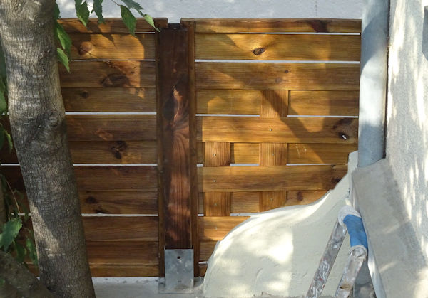 Les lattes du morceau découpé n’étant plus retenues à grand chose, Anti a ensuite imaginé des cales faites avec des chutes de la palissade, donc du même bois, pour recréer un entrelacement, fixé avec quelques petites vis discrètes. Anti a aussi peint en blanc cassé le pignon en béton aux formes arrondies pour que ça fasse plus joli.