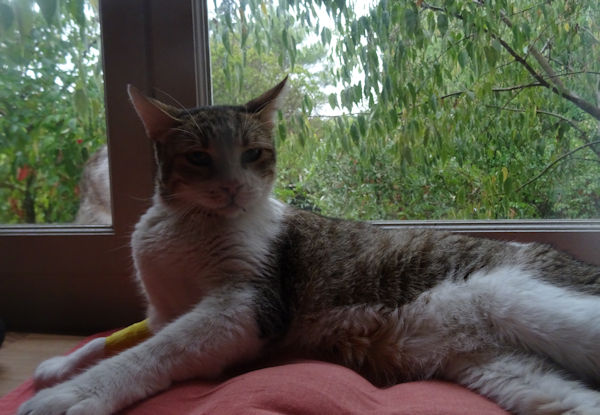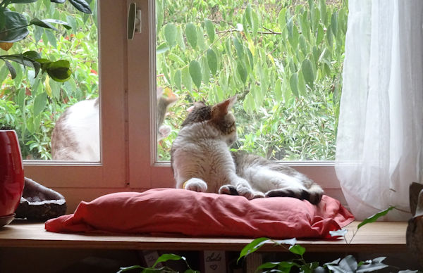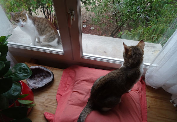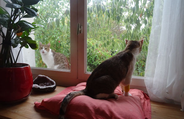 Quel soulagement ! Heureux, le minou. Petite série de photos à son retour à la maison hier après-midi, avec son quasi sosie Joli Coeur.