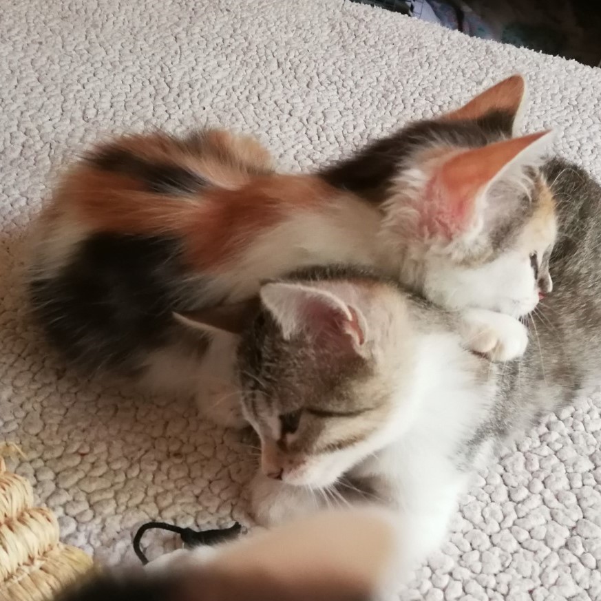 Nous sommes très heureux pour ces deux adorables chatonnes, très copines entre elles (la preuve, cette photo qui avait servi pour l’annonce).