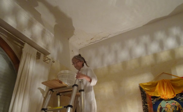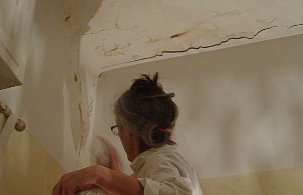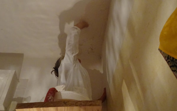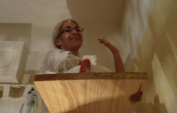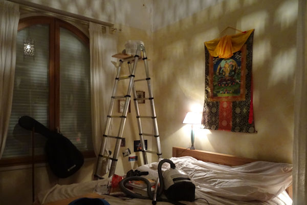 Le weekend avait commencé de façon presque normale pour un weekend, à savoir à glander, même pour Anti, ce qui est exceptionnel. Quand le soir est tombé en cette fin de dimanche, le naturel a repris le dessus au galop. Anti a déployé dans notre chambre la nouvelle échelle télescopique qu’elle vient d’acquérir pour enduire un angle du plafond détérioré par une fuite d’eau il y a quelques années, fuite réparée depuis. Je vous laisse admirer l’artiste en action.