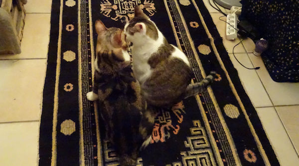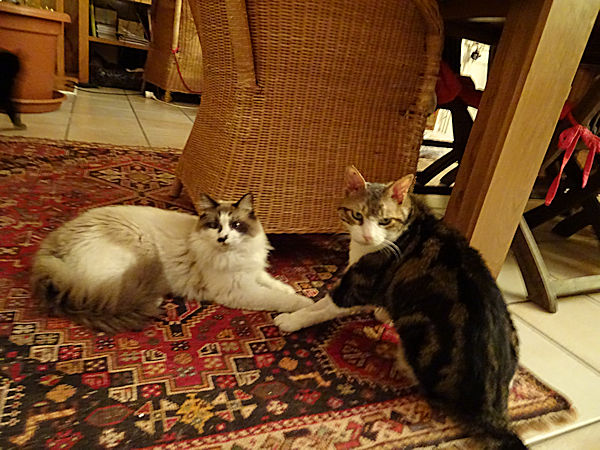 S’il y a une chose que Malley apprécie, c’est de passer du temps avec ses amis. Et des amis, il en a plein au sein de la communauté féline de la maison : Will, Che, Morphée (ses préférés dans les grands chats) et aussi Bianco, même si ce dernier est parfois quelque peu turbulent face à la placidité de Malley qui ne se laisse pas faire pour autant. Le voici ici avec son très câlin copain, Che :