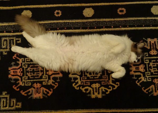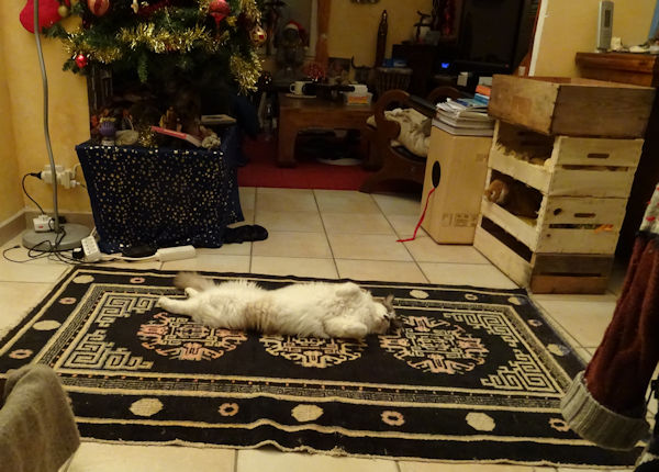 Un chat peut montrer de diverses façons qu’il se sent parfaitement en sécurité. L’une d’entre elles est de dormir sur le dos, en plein milieu d’une grande pièce, parfaitement convaincu que rien ne peut lui arriver (ce qui est le cas chez nous). Voici Bianco hier en fin d’après-midi :