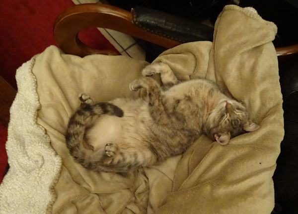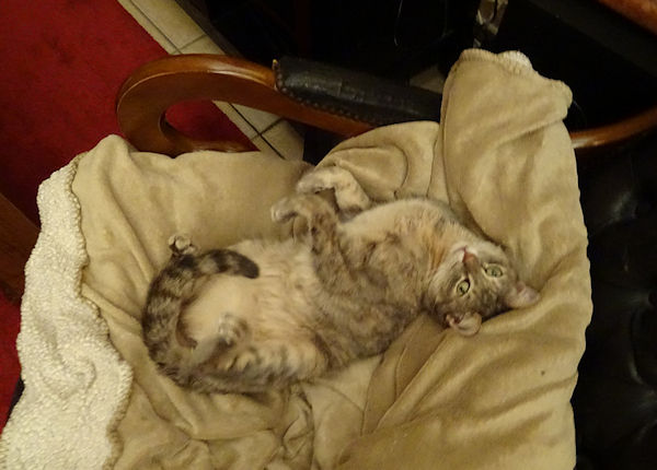 Vraiment très détendu. D’ailleurs, même Crevette, la plus sauvageonne de nos minous (mais de moins en moins), s’y est mise aussi quelques minutes plus tard :