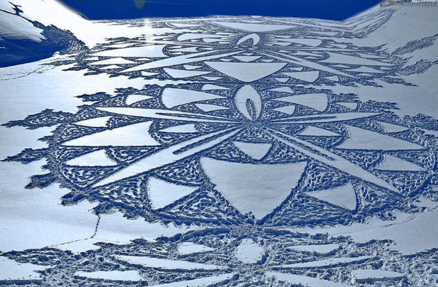 Pour la petite histoire, ce monsieur s’appelle Simon Beck, ingénieur de formation, il fait partie de ceux qu’on appelle les « snow artists ». Voyez plutôt :