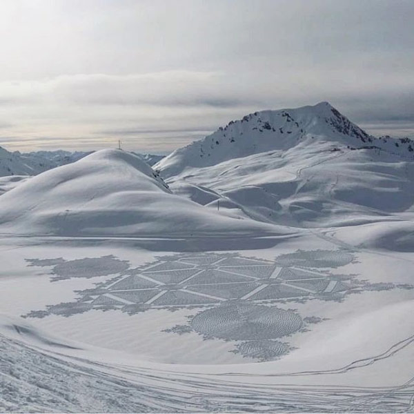 Pour la petite histoire, ce monsieur s’appelle Simon Beck, ingénieur de formation, il fait partie de ceux qu’on appelle les « snow artists ». Voyez plutôt :