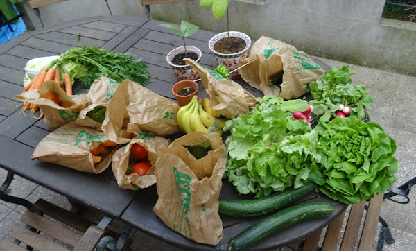 Pendant qu’Anti s’aérait en allant jusqu’à la pharmacie récupérer des médicaments, j’ai reçu la livraison de la commande de produits frais bio que nous attendions. Le livreur avait un masque et avait déposé les sacs en papier devant le portail. Je les ai mis à l’intérieur de notre terrain en attendant qu’Anti revienne pour les ranger comme elle le souhaite.