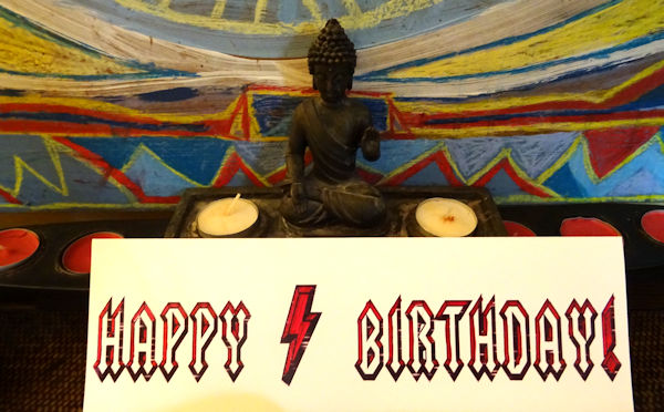 Après mon anniv lundi, nous avons fêté hier celui d’Anghbor, fils aîné de Stéphanie. Il a eu ses cadeaux dans la journée, accompagnés d’une jolie calligraphie faite par sa maman dans le plus pur style métalleux.