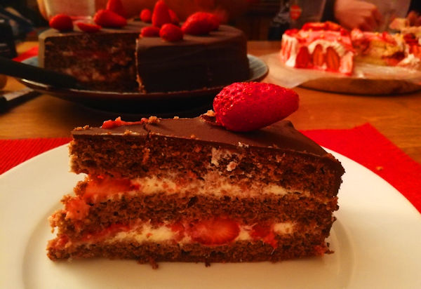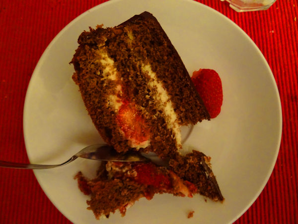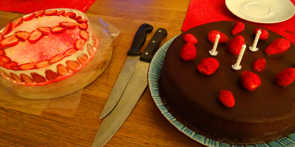 Mais le moment le plus attendu était le repas du soir, avec l’un de ses plats favoris cuisiné par sa maman (accompagné d’un Gigondas fort apprécié offert par Ben et Gwlad) et surtout, surtout, le gâteau aux fraises fait par sa sœur. Sans oublier celui, plein de chocolat et de fraises aussi, fait pour sa maman qui fêtait l’anniversaire de son accouchement. Je ne vous fais pas languir plus longtemps, voici quelques photos :