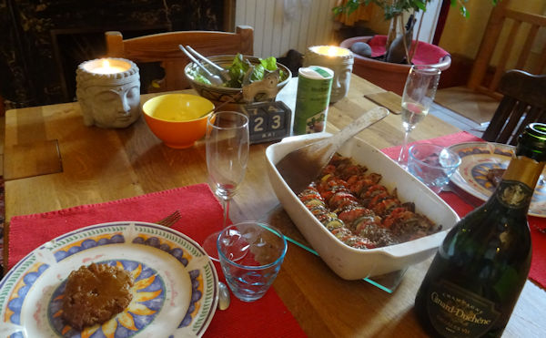 La soirée s’est écoulée autour d’un dîner en tête à tête, accompagné d’une bouteille de champagne Canard Duchêne Charles VII brut. Pour le menu, j’ai cuisiné ma version de la ratatouille à la Ratatouille (le dessin animé). Quelques photos pour vous montrer la préparation :