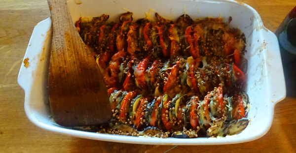 Inutile d’ajouter de l’eau, ce sont les tomates qui vont la fournir en cuisant. Ensuite, un peu de fromage râpé bio, saupoudré de grains de coriandre et de grains de cumin, puis au four à 130° pendant 1 h 45 – la cuisson lente, rien de mieux pour avoir des plats gouleyants.